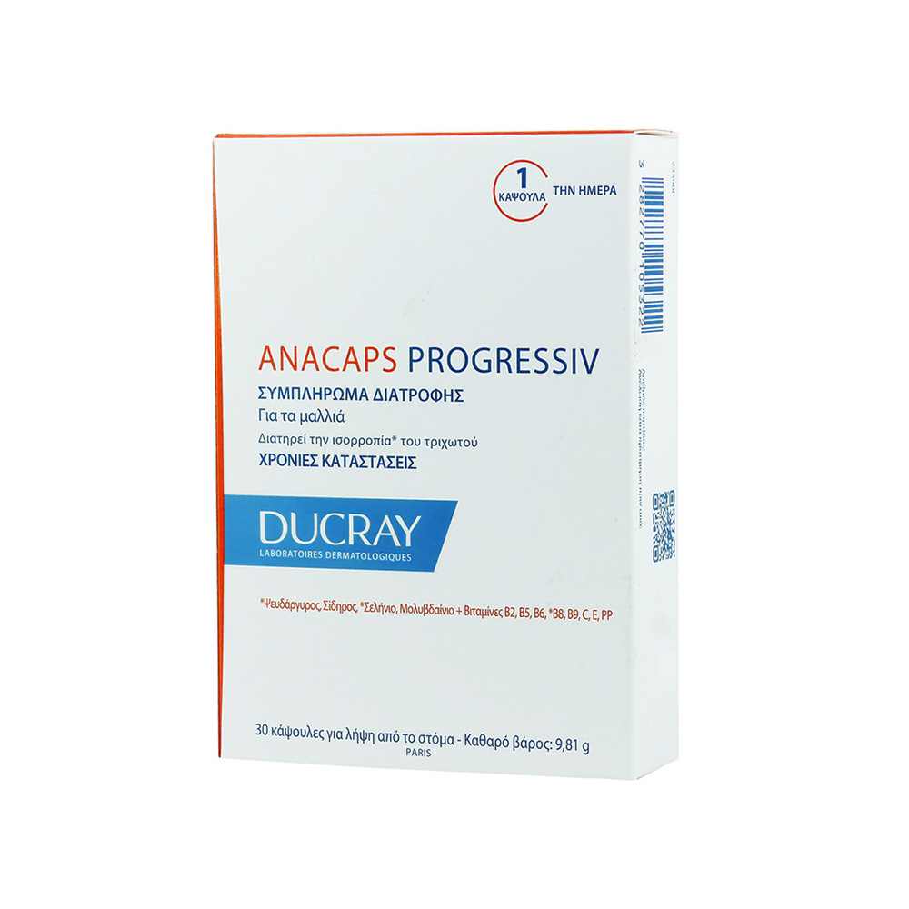Η πρωτότυπη σύνθεση του ANACAPS PROGRESSIV προσφέρει στον βολβό της τρίχας βιοτίνη (βιταμίνη Β8), ψευδάργυρο, σελήνιο που συμμετέχουν στη διατήρηση μιας υγιούς τρίχας και βιταμίνη Β6 που συνεισφέρει στην ομαλή σύνθεση της κυστεΐνης.