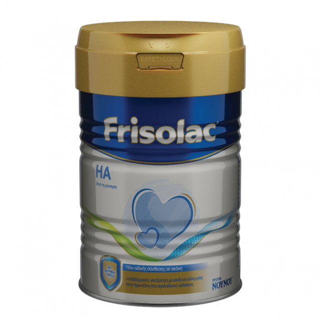 Το μητρικό γάλα είναι ό,τι καλύτερο για το μωρό σας. To Frisolac HA είναι γάλα ειδικής σύνθεσης σε σκόνη, στιγμιαίας παρασκευής, κατάλληλο για τη διαιτητική αγωγή των βρεφών µε κίνδυνο αλλεργίας στην πρωτεΐνη του αγελαδινού γάλακτος. Περιέχει μερικώς υδρολυμένη πρωτεΐνη που μειώνει τον κίνδυνο αλλεργικής αντίδρασης. Επιπλέον, περιέχει όλες τις απαραίτητες βιταμίνες, ιχνοστοιχεία, αμινοξέα και λιπαρά οξέα για την υγιή ανάπτυξη των βρεφών και καλύπτει τις ειδικές διατροφικές τους ανάγκες. Επίσης περιέχει DHA όπως απαιτεί η Νέα Ευρωπαϊκή νομοθεσία για τα Βρεφικά Γάλατα.
